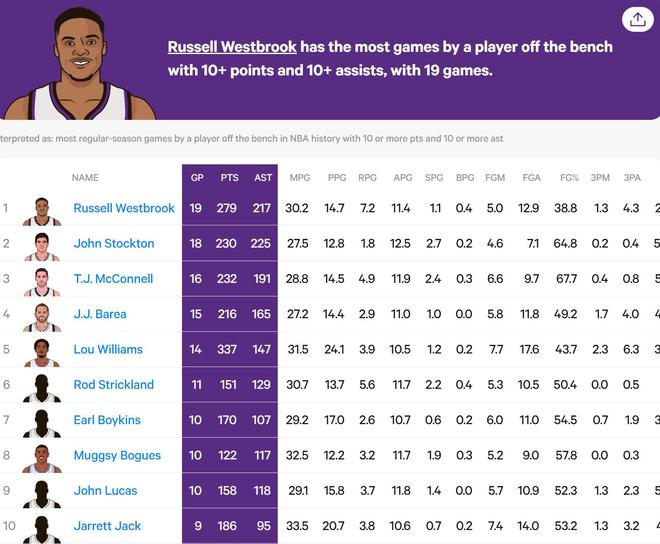 本场比赛是威少职业生涯第19次替补拿到10+分和10+助攻,据统计,威少是目前NBA历史上做到该成就次数最多的球员。此前威少与爵士名宿约翰-斯托克顿并列排在该榜单第一位。